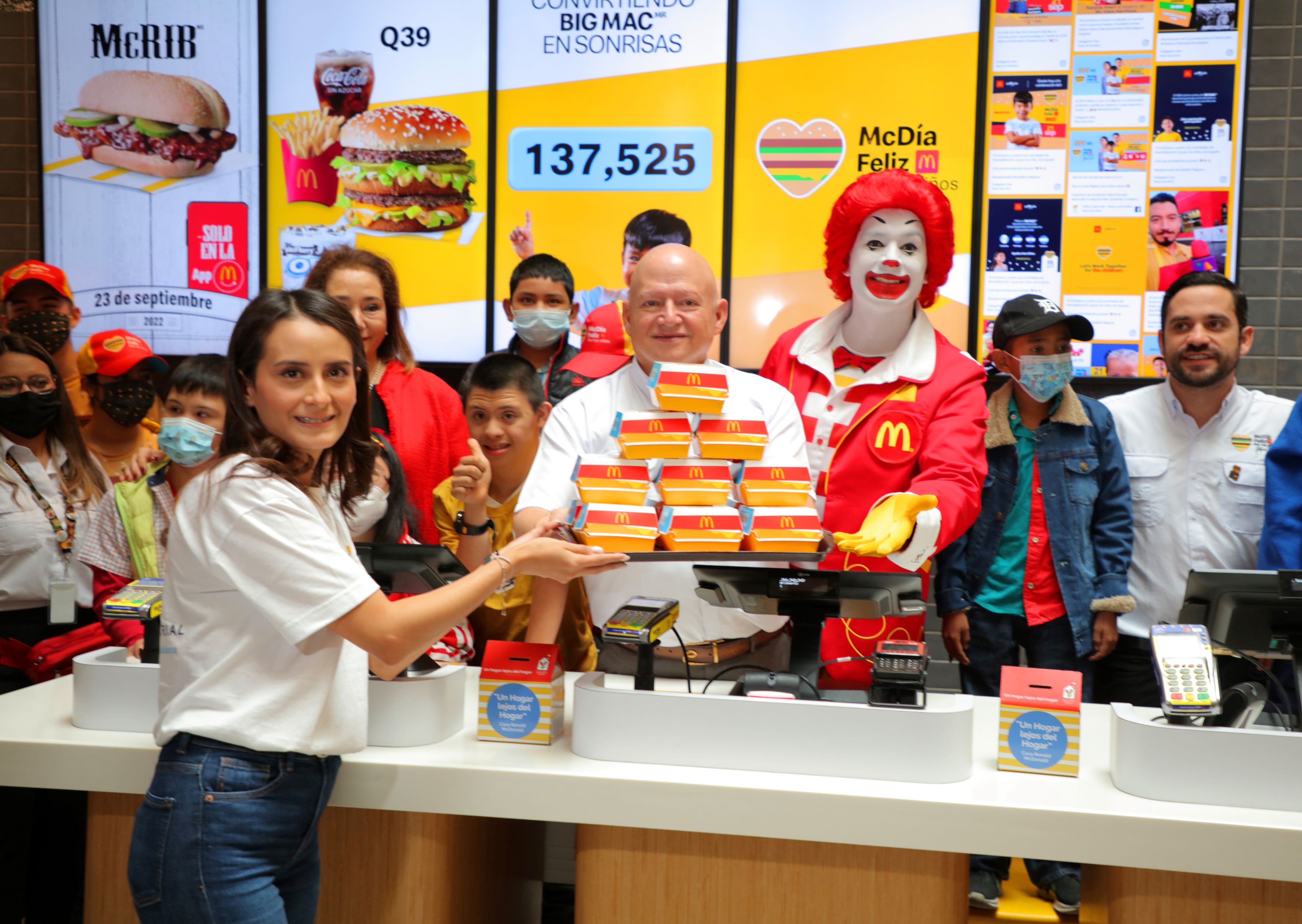 El acto de inauguración del McDía Feliz 2022 se llevó a cabo en el restaurante McDonald’s No. 100 con la venta del “Primer Big Mac” a cargo de Álvaro Cofiño, Presidente de McDonald’s Mesoamérica; Patty Cofiño, Directora de Cultura Organizacional y Rodrigo Cofiño, Gerente de Extensiones de Marca, quienes estuvieron acompañados de Ronald McDonald y niños de las diferentes fundaciones que se apoyarán.